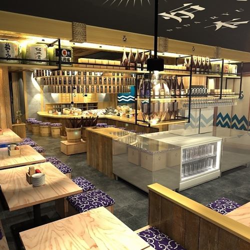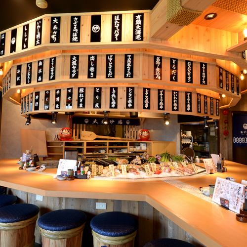 開放感あふれるこだわりの空間で、大衆炉端の魅力をじっくり満喫!活気ある店内では、目の前で焼き上がる臨場感と櫂で提供される演出が楽しめる劇場型カウンターが人気です。見て楽しく、食べて美味しい時間を演出♪デートからプライベート宴会まで幅広く利用でき、賑わいの中でも心地よく過ごせます◎